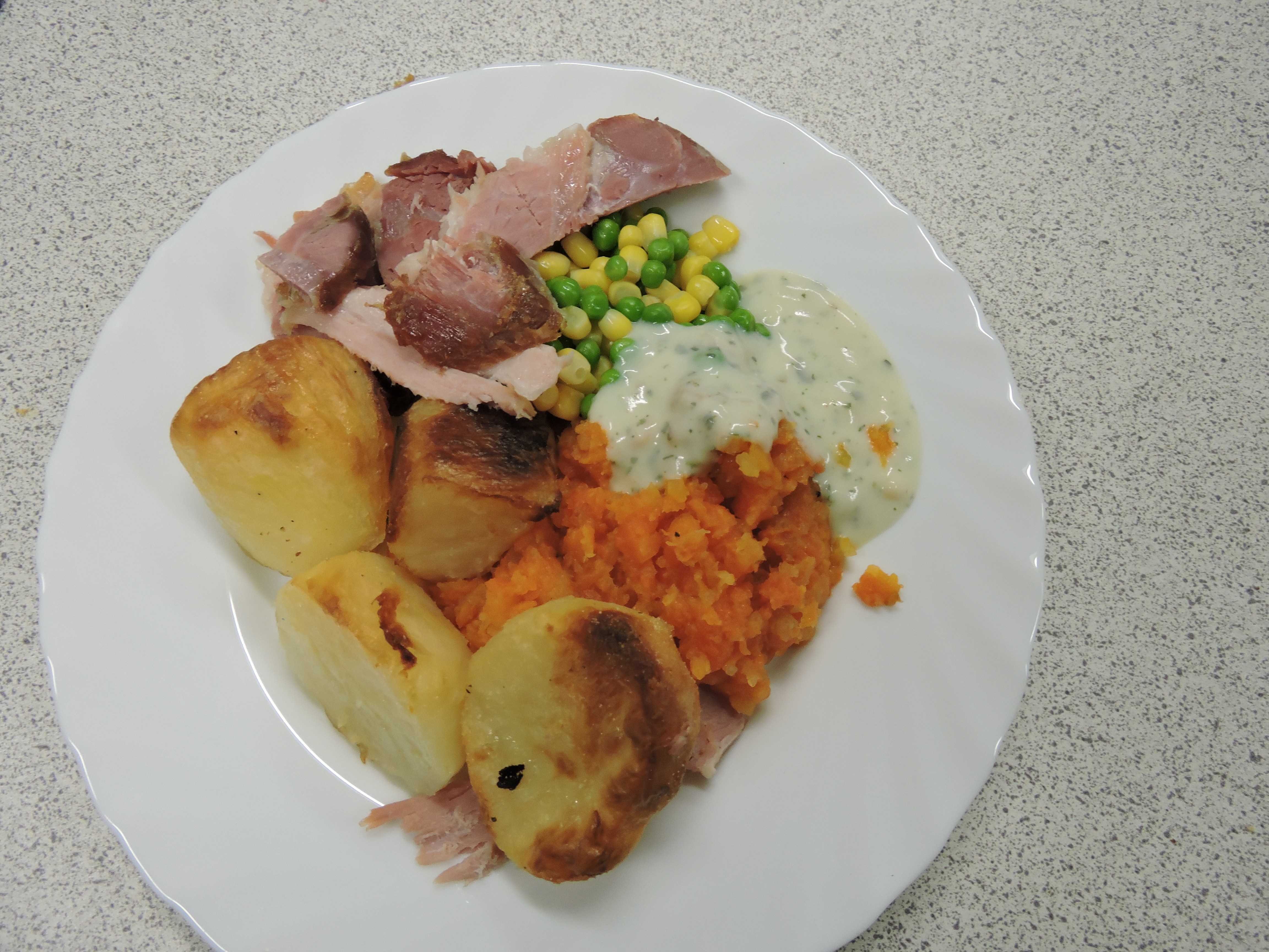 their own right winning prizes. We met to enjoy a supper of ham with parsley sauce, roast potatoes, peas, sweet corn and carrots.